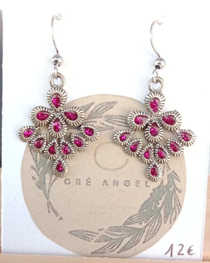 Jolies boucles d'oreilles esprit vintage de couleur blanche agrémentées de paillettes roses fuchias ornées d'une intercallaire cristal rose pâle. Les crochets sont en acier inoxydables garantis sans plomb, cadnium et nickel.