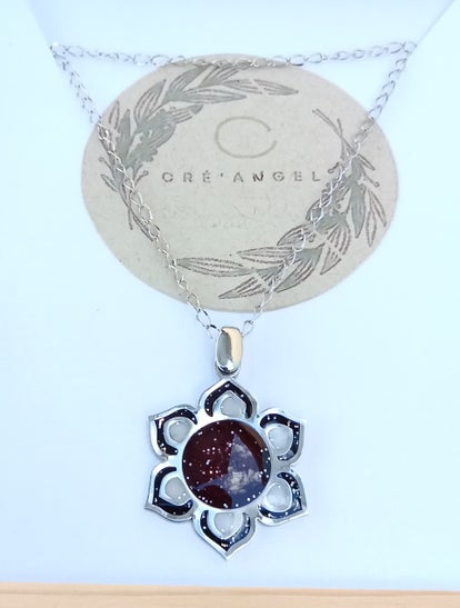 Collier pendentif fleur 33*35mm. Le centre de la fleur est au couleur chocolat pailleté, les pétales sont de couleur blanc pailletté et noir pailletté.