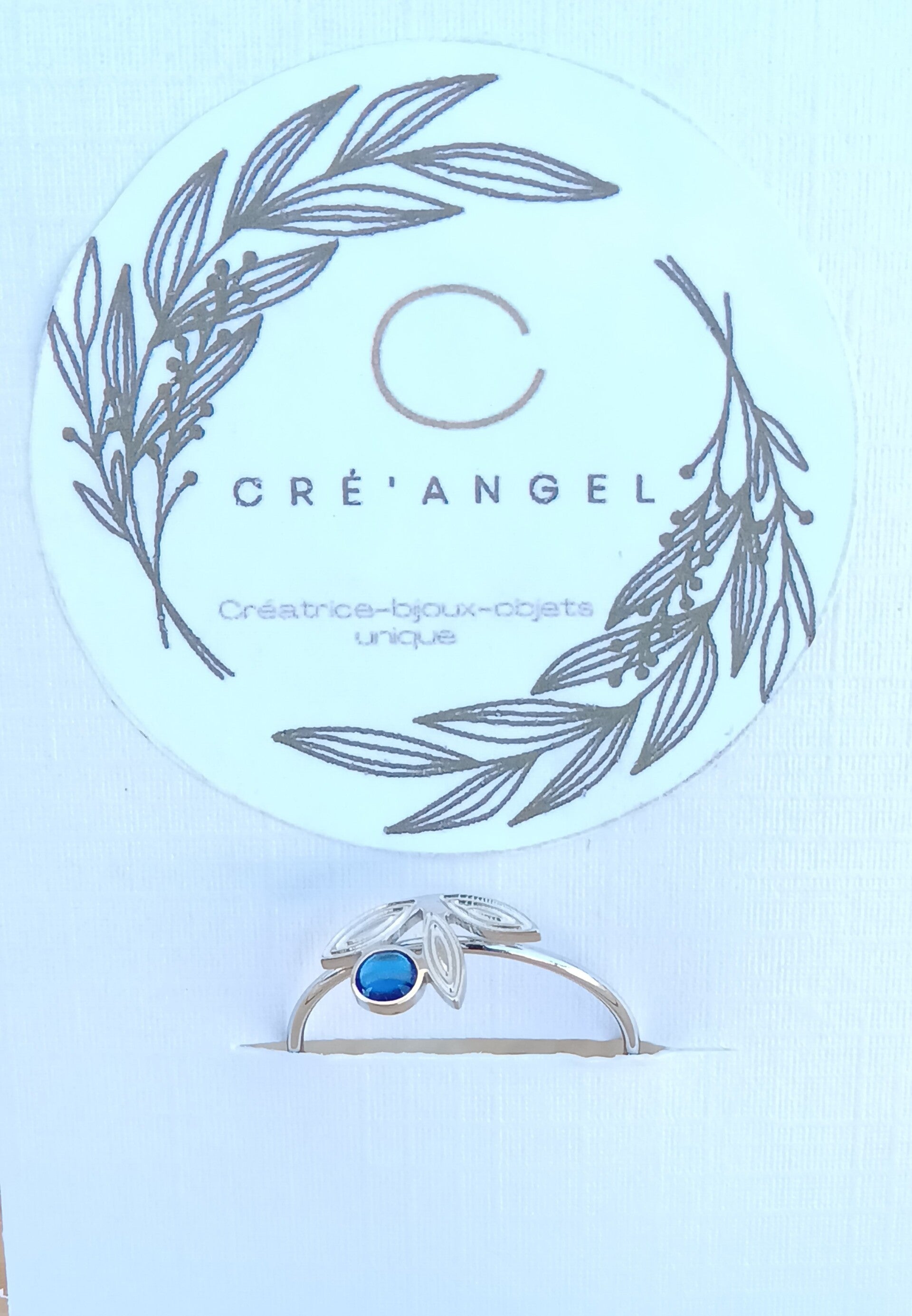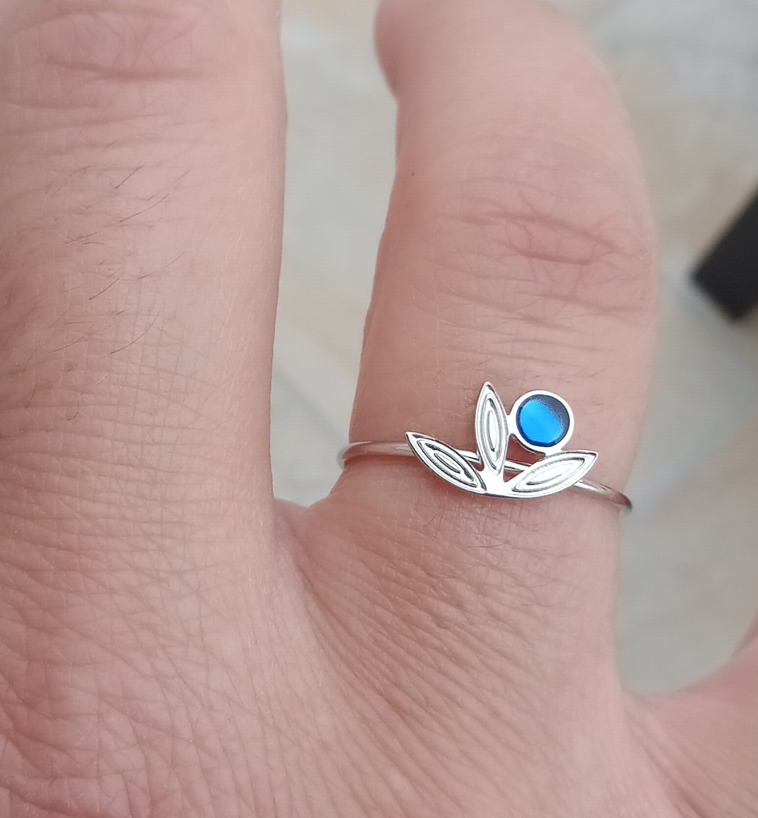Bague fine motif fleur avec son coeur en résine bleu.