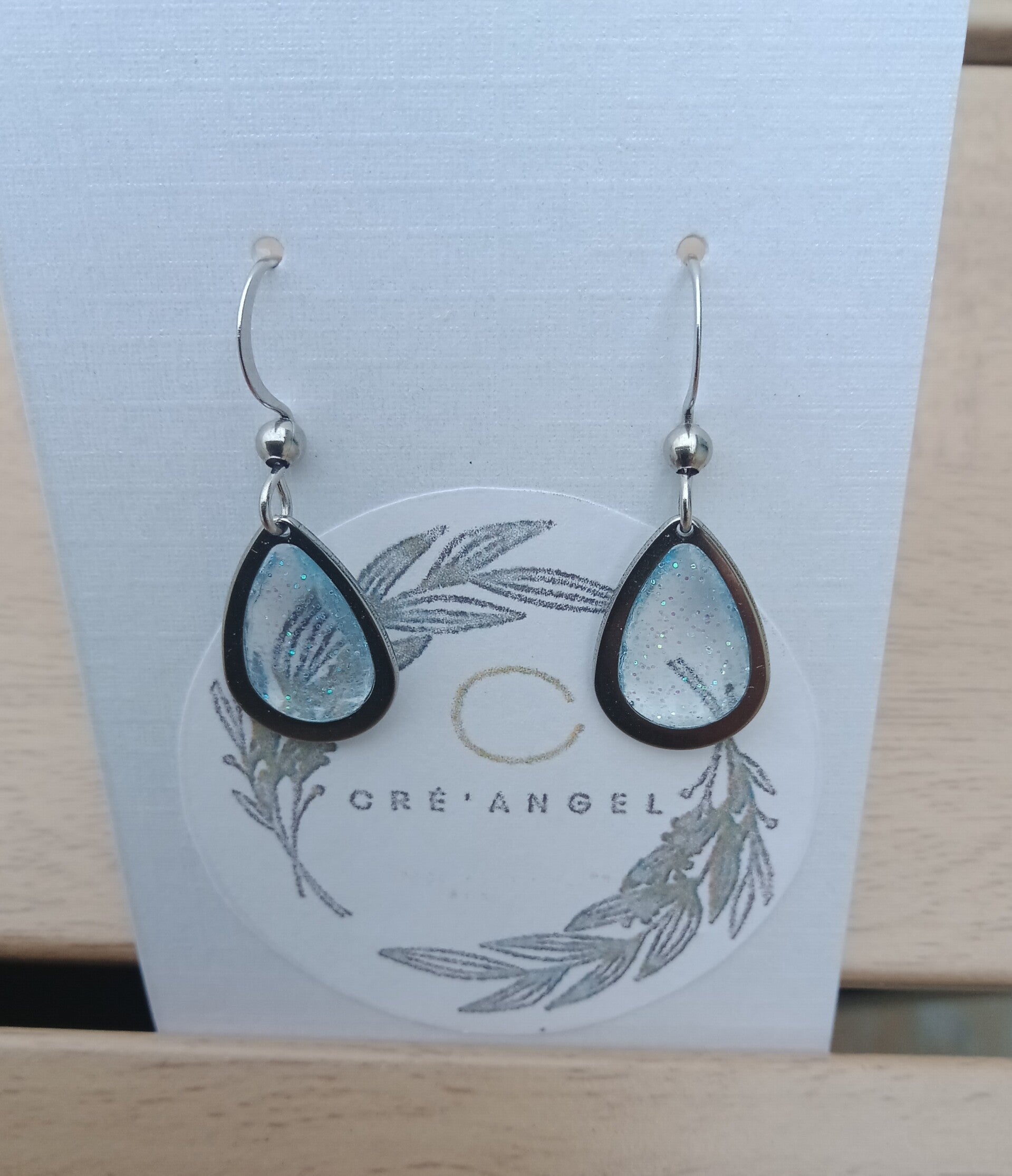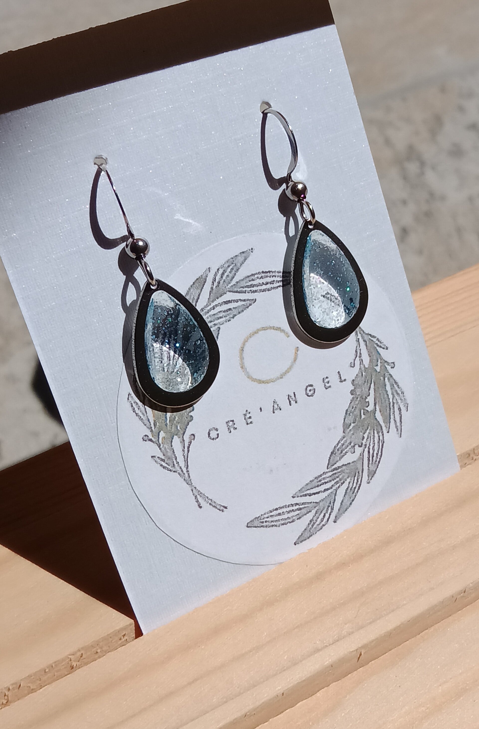 Boucles forme goutte de couleur bleu ciel transparent et ses paillettes irisées réalisées en résine UV.
