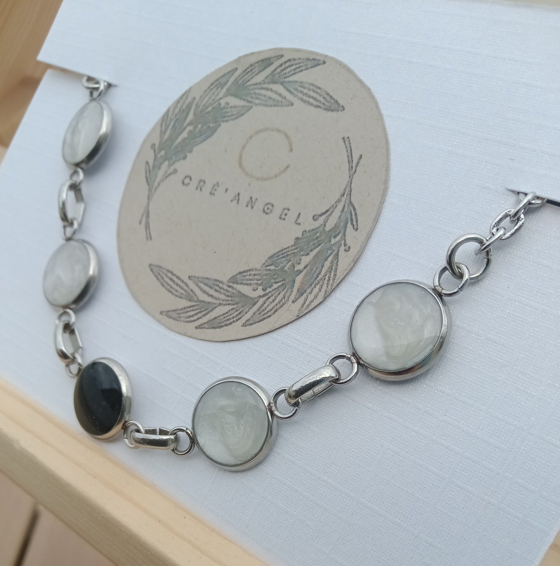 Bracelet réalisé en résine aux couleurs noire et blanc nacré.