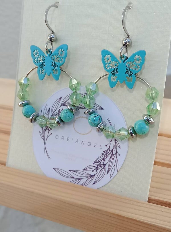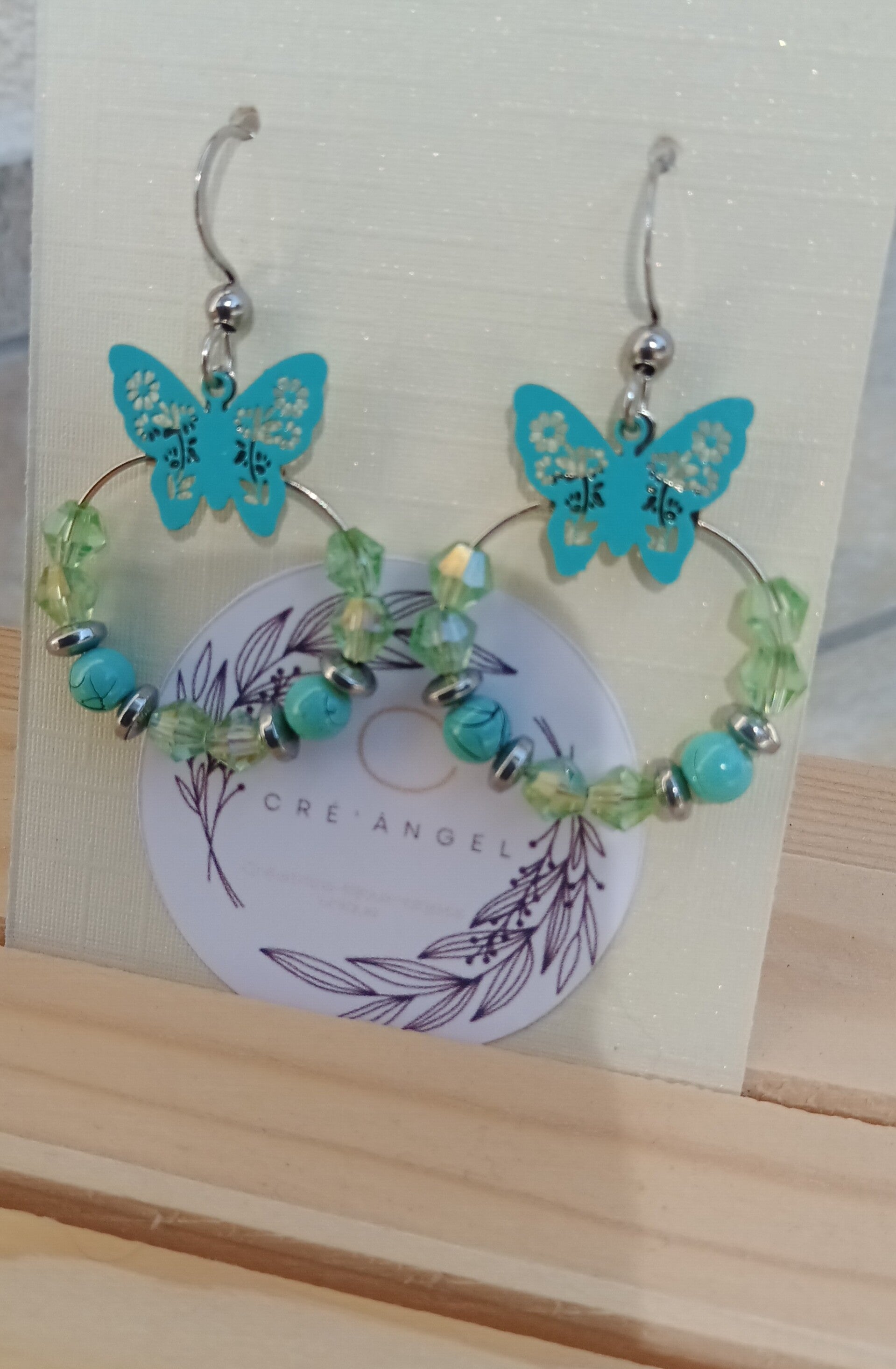 Petites créoles ornées de perles toupies vertes, de perles plates en métal argenté, de perles rondes vert d'eau avec quelques liserés noirs et deux estampes filigrane papillon vert d'eau 14 mm.
