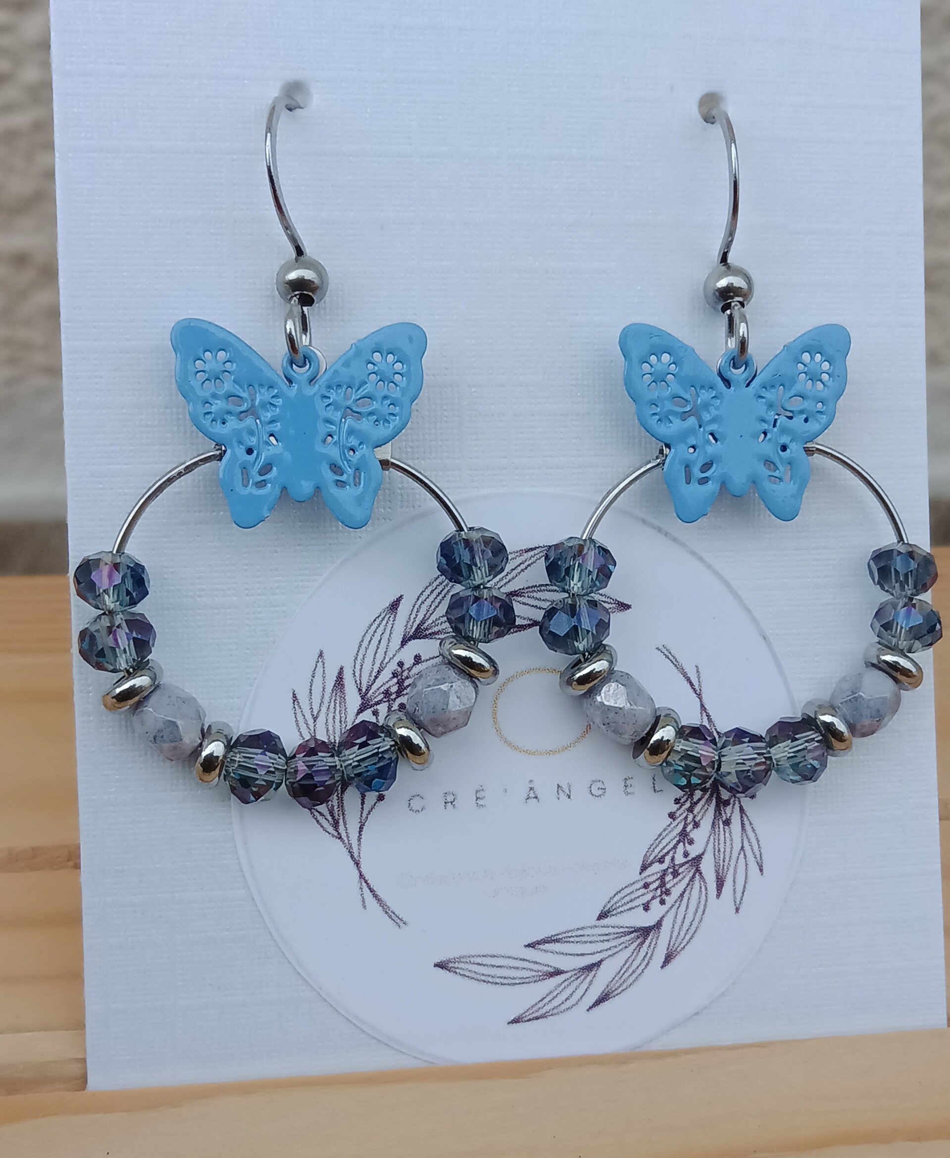 Petites créoles ornées de perles facettes couleur violet transparent irisé, de perles mauves brillantes, de perles intercalaires en acier inoxydable et de deux estampes filigranes bleu/lavande de 14 mm.