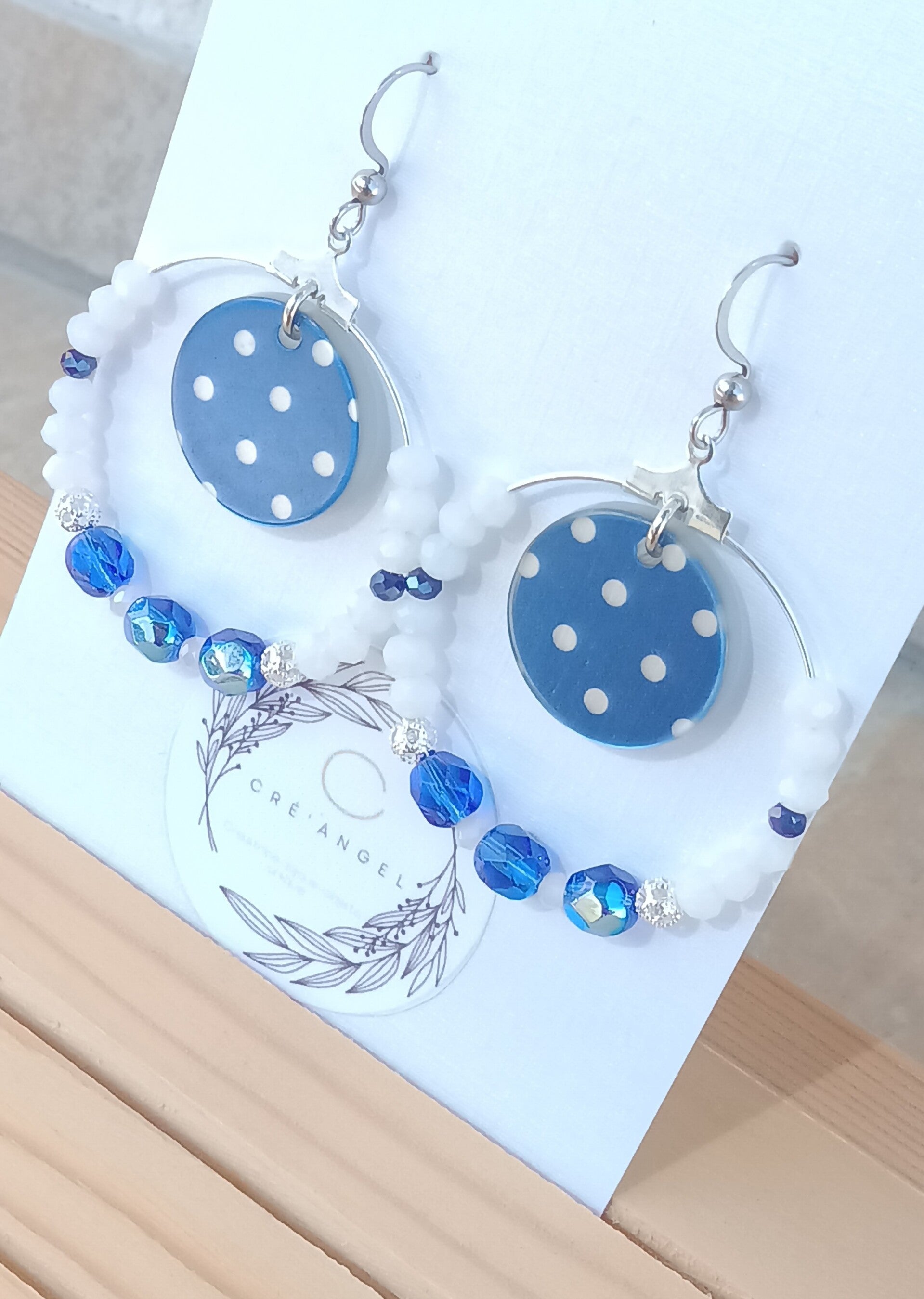 Ces boucles se composent de perles en verre facettes aux couleurs blanc 4 mm, bleu nuit 2 mm, bleu sapphire AB 6 mm, blanc 2 mm et de perles rondes filigranées 4 mm placage argent fin. Elles sont ornées d'un sequin en acrylique pois bleu 20 mm.