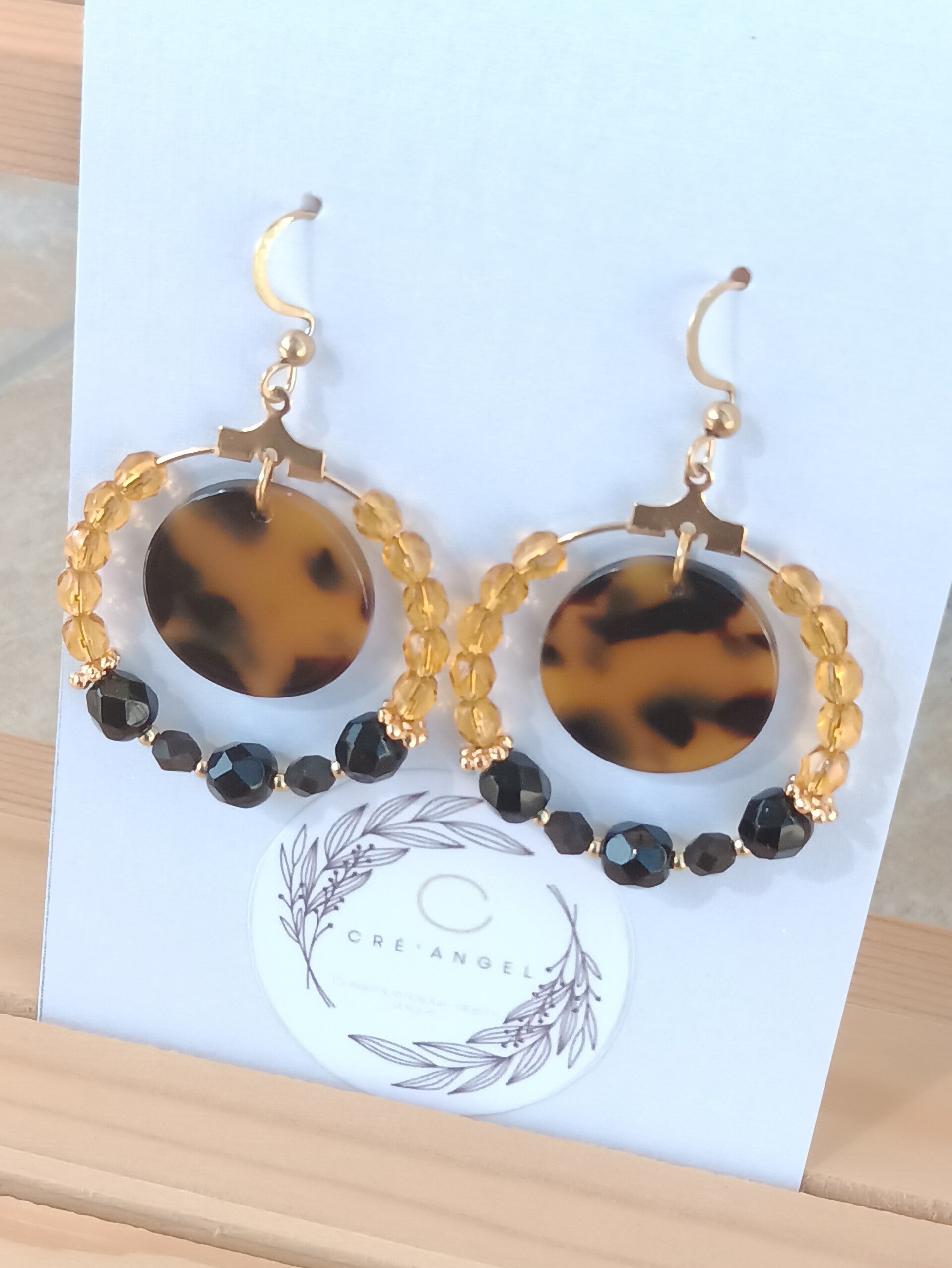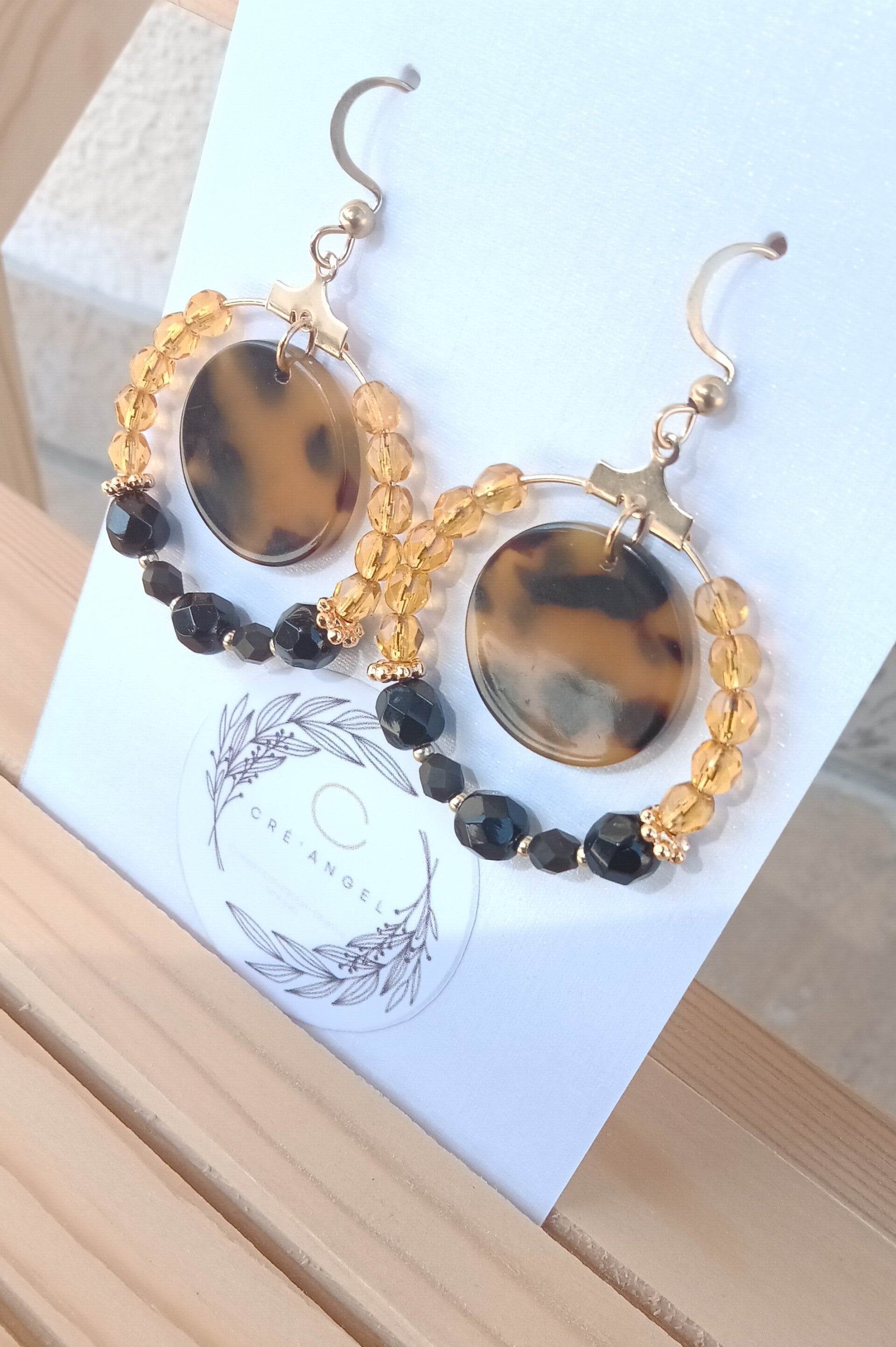 Ces boucles se composent de perles en verre facettes couleur topaz 4 mm, jet 6 mm, wild raisin mat 4 mm, de perles rondelles fleurs 5 mm dorées à l'or fin et de petites perles en acier inoxydable dorées à l'or fin 2 mm. Elles sont ornées d'un sequin rond en acétate de cellulose écaille de tortue marron/noir 20 mm.