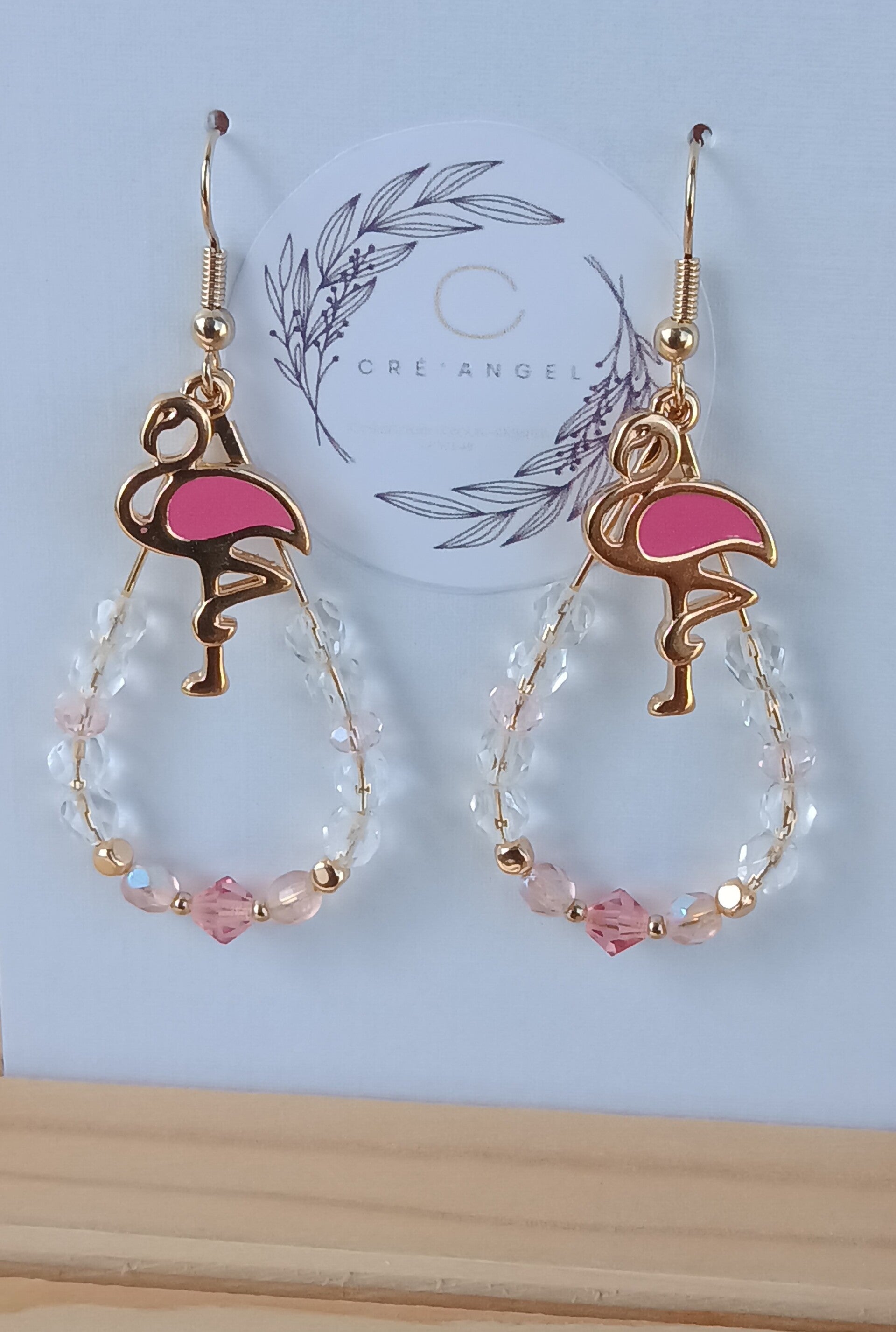 Ces boucles se composent de perles en verre facettes aux couleurs crystal 5 mm, rose transparent 4 mm, rosaline 4 mm, perles en verre forme toupie couleur rose peach 5 mm, de perles rondes 4 faces dorées à l'or fin 3 mm et de perles rondes dorées à l'or fin 2 mm. Elles sont ornées d'un flamand rose en métal doré résine époxy 24 mm.