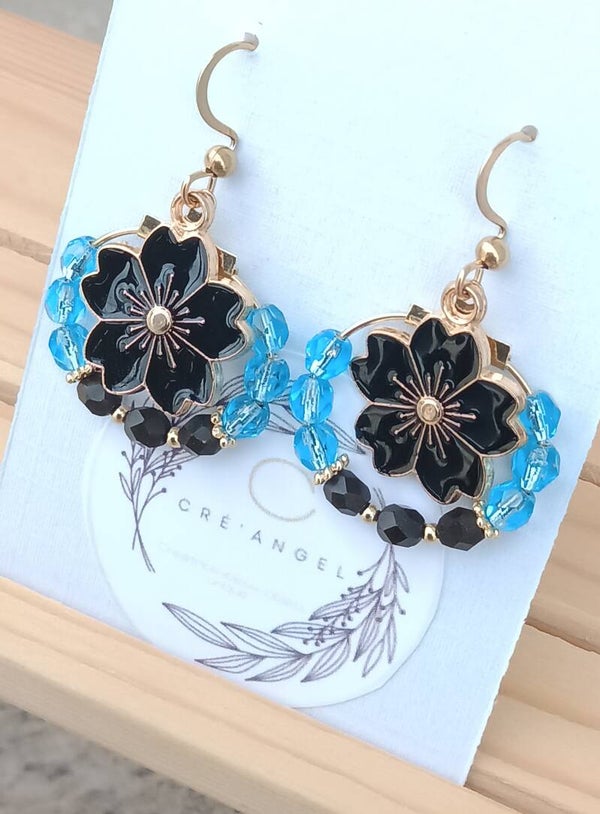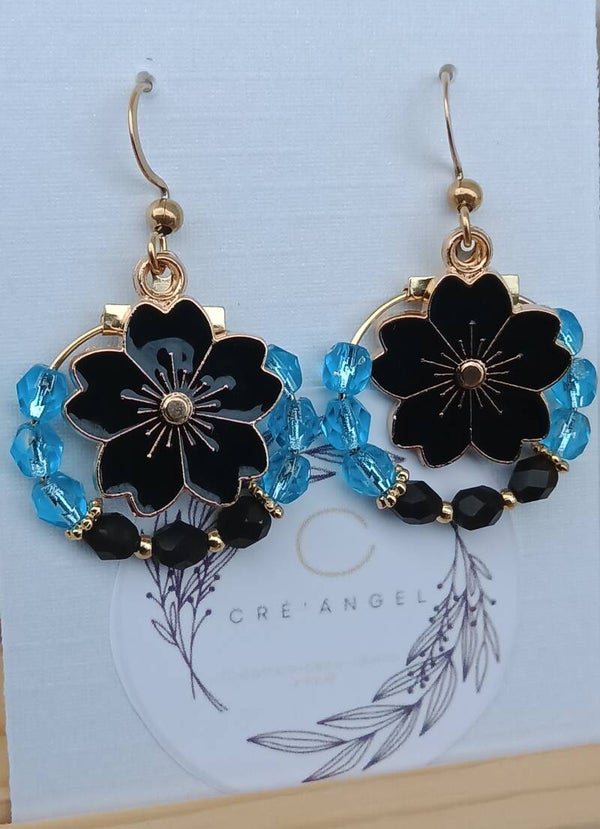 Ces boucles se composent de perles en verre facettées 4 mm couleur Aquamarine et wild raisin mat, de perles rondelles fleur 4 mm dorées à l'or fin et de perles rondes 2 mm en acier inoxydable or. Elles sont ornées d'un pendentif Fleur de Sakura noir en métal émaillé doré diamètre 17 mm.