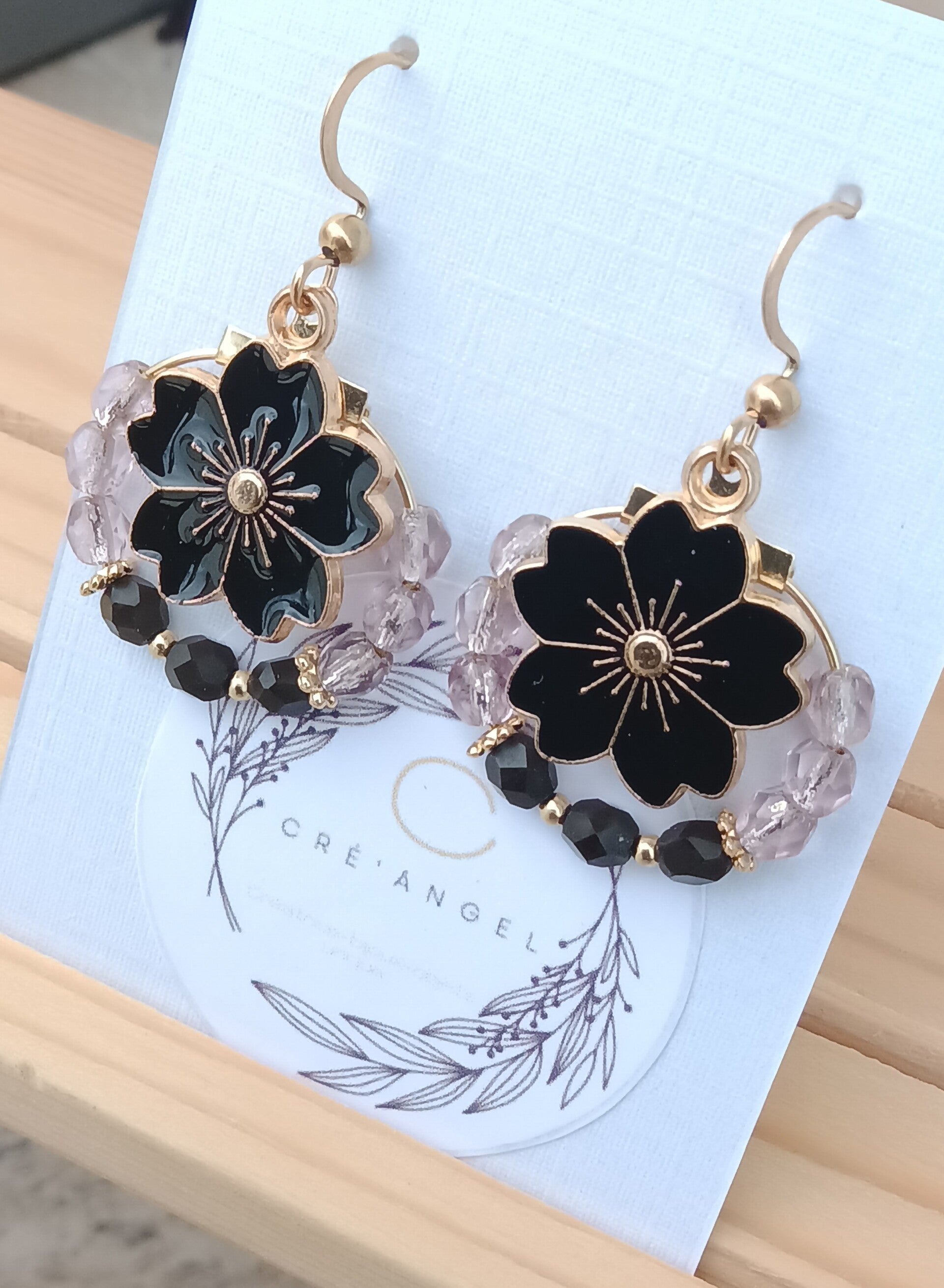 Ces boucles se composent de perles en verre facettées 4 mm couleur Améthyste et wild raisin mat, de perles rondelles fleur 4 mm dorées à l'or fin et de perles rondes 2 mm en acier inoxydable or. Elles sont ornées d'un pendentif Fleur de Sakura noir en métal émaillé doré diamètre 17 mm.