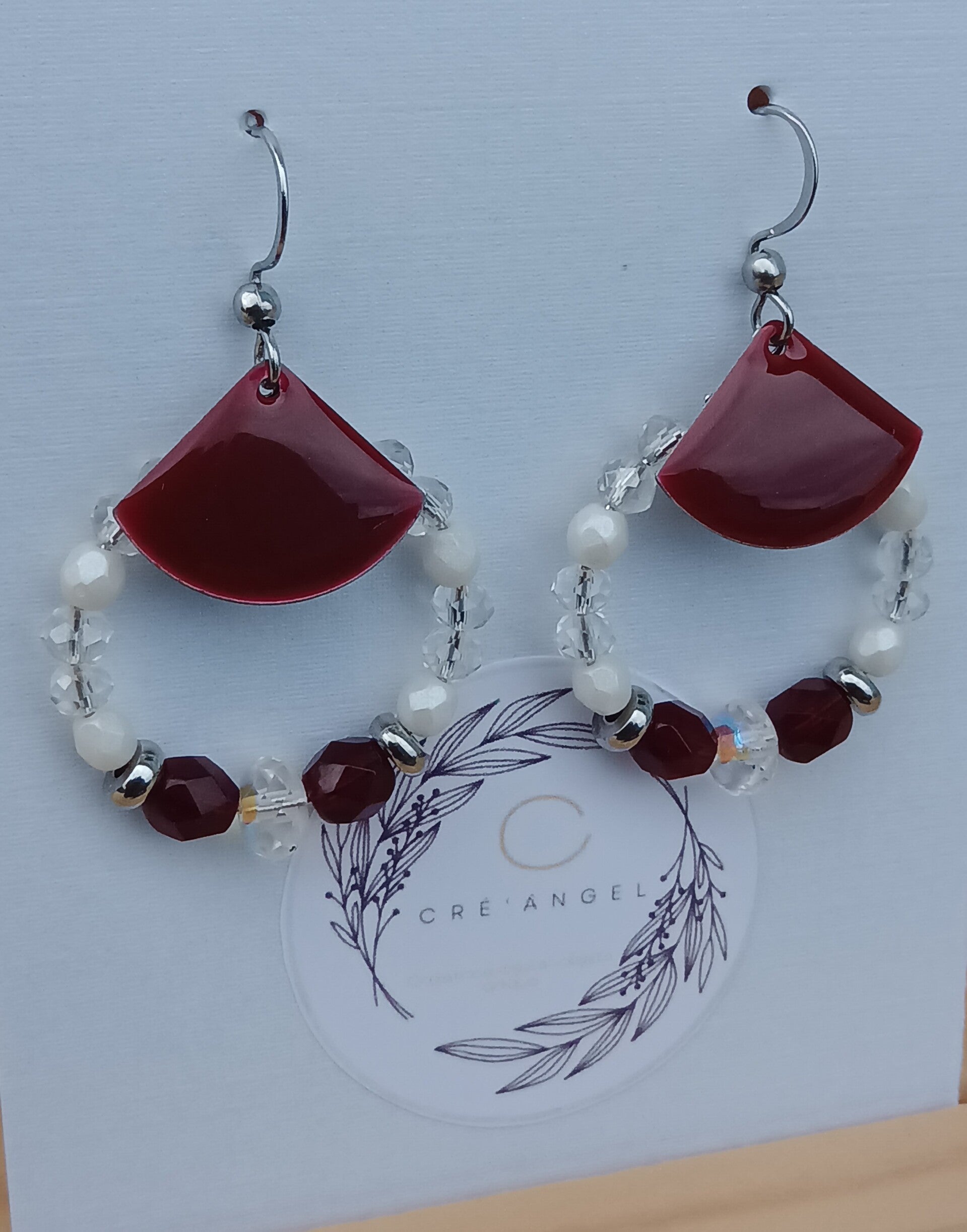 Ces boucles se composent de perles facettes rondes en verre 4 mm couleur crystal , de perles facettes en verre couleur blanc nacré irisé, de perles facettes en verre 6 mm couleur bordeaux, de perles en verre donuts 7*4 mm crystal AB et de perles rondelles lisses 5 mm en acier inoxydable. Elles sont ornées d'un sequin éventail en laiton et résine époxy 15*20 mm couleur bordeaux.