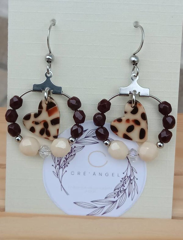 Ces boucles se composent de perles en verre facettes aux couleurs chocolat et crystal 4 mm , de perles en verre facettes beige ceramic 6 mm et de perles rondes lisses 2 mm. Elles sont ornées d'un coeur en acétate 12 mm tacheté effet léopard.