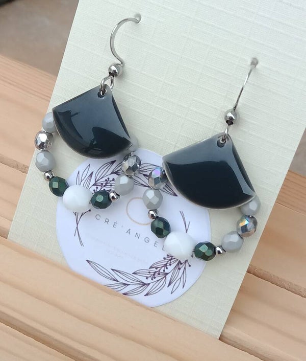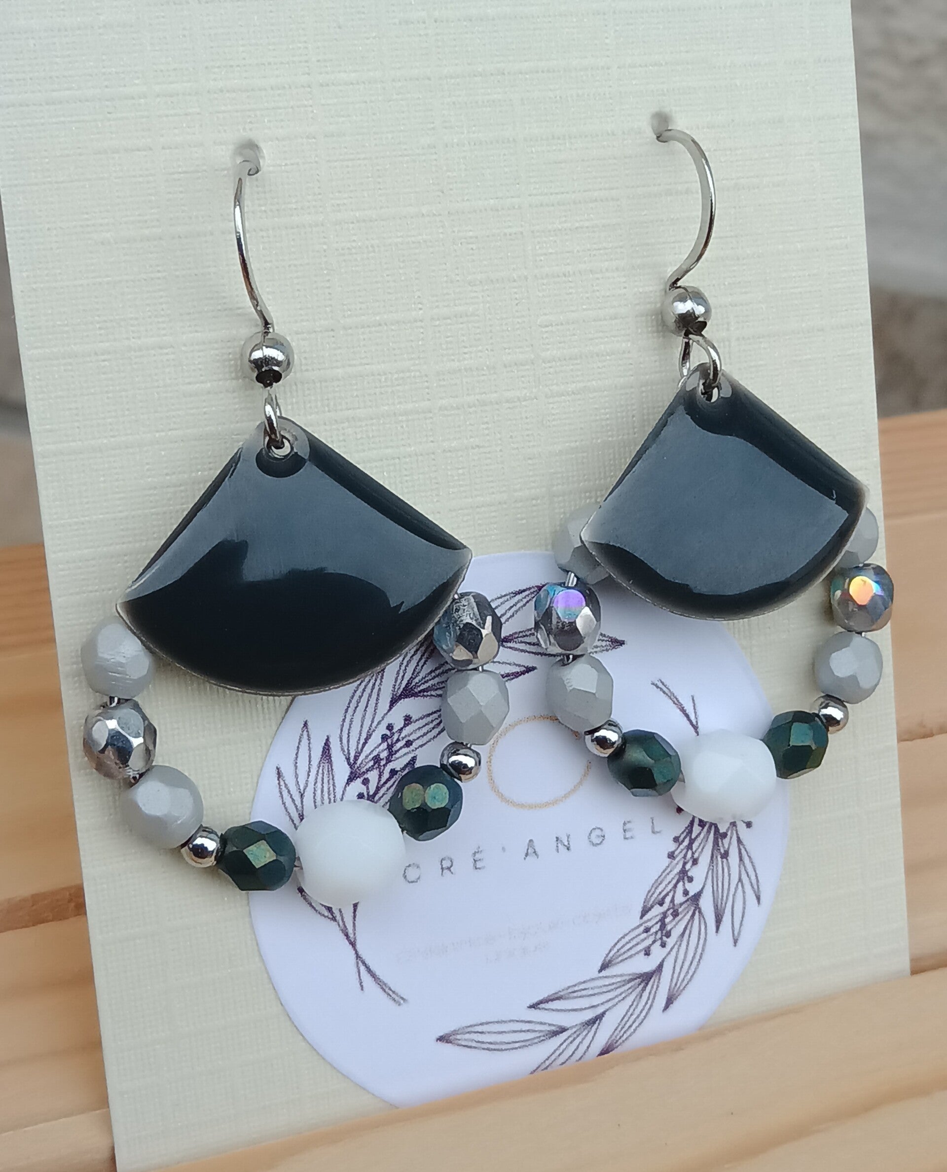 Ces boucles se composent de perles en verre facettees 4 mm aux couleurs gris pastel, crystal argent rainbow, vert irisé mat avec nuances, de perles en verre facette 6 mm blanc opaque mat et de perles rondes lisses 2 mm en acier inoxydable. Elles sont ornées d'un sequin évantail en laiton et résine époxy 15*20 mm gris moyen.